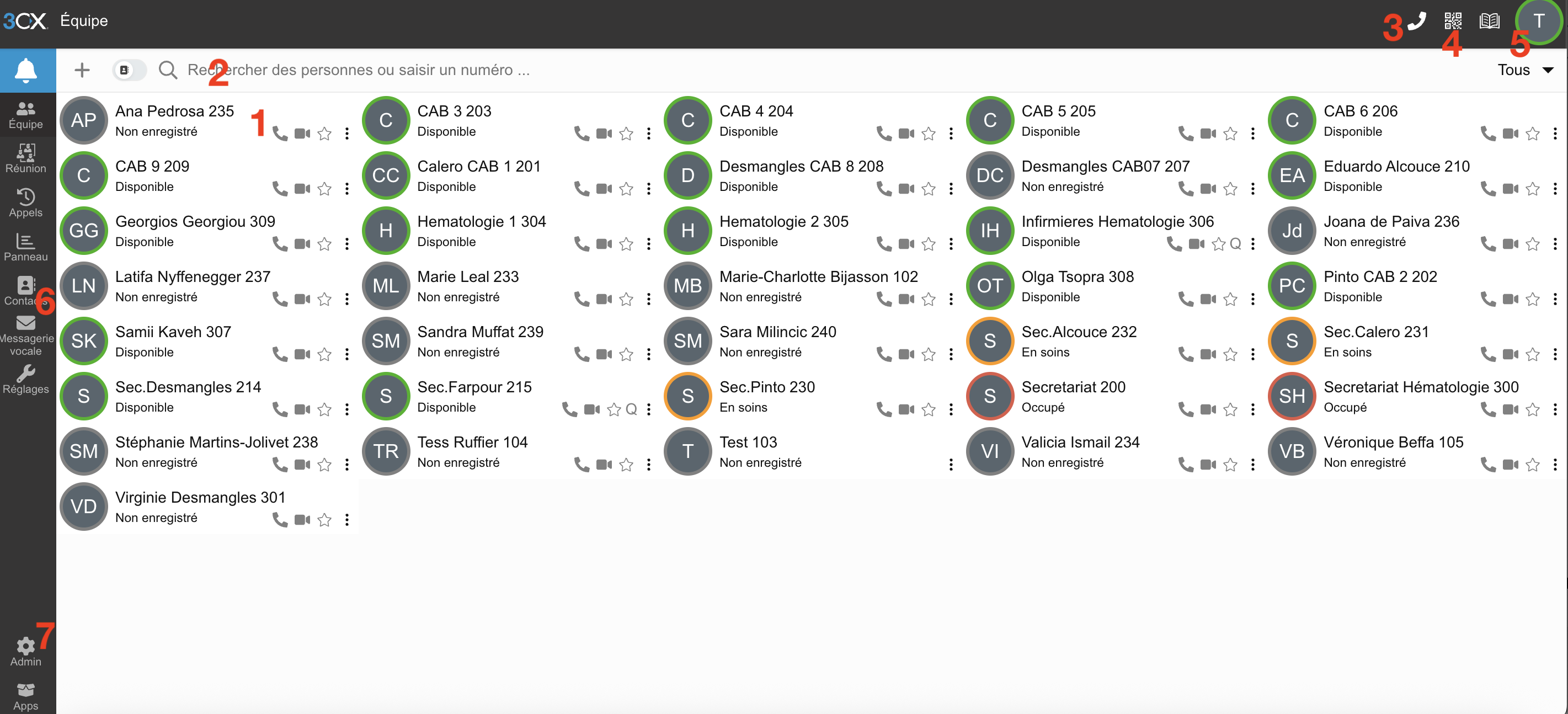 1) Consulter le statut des utilisateurs (cercle de couleur autour du nom de la personne) ainsi que les appeler d'un clic