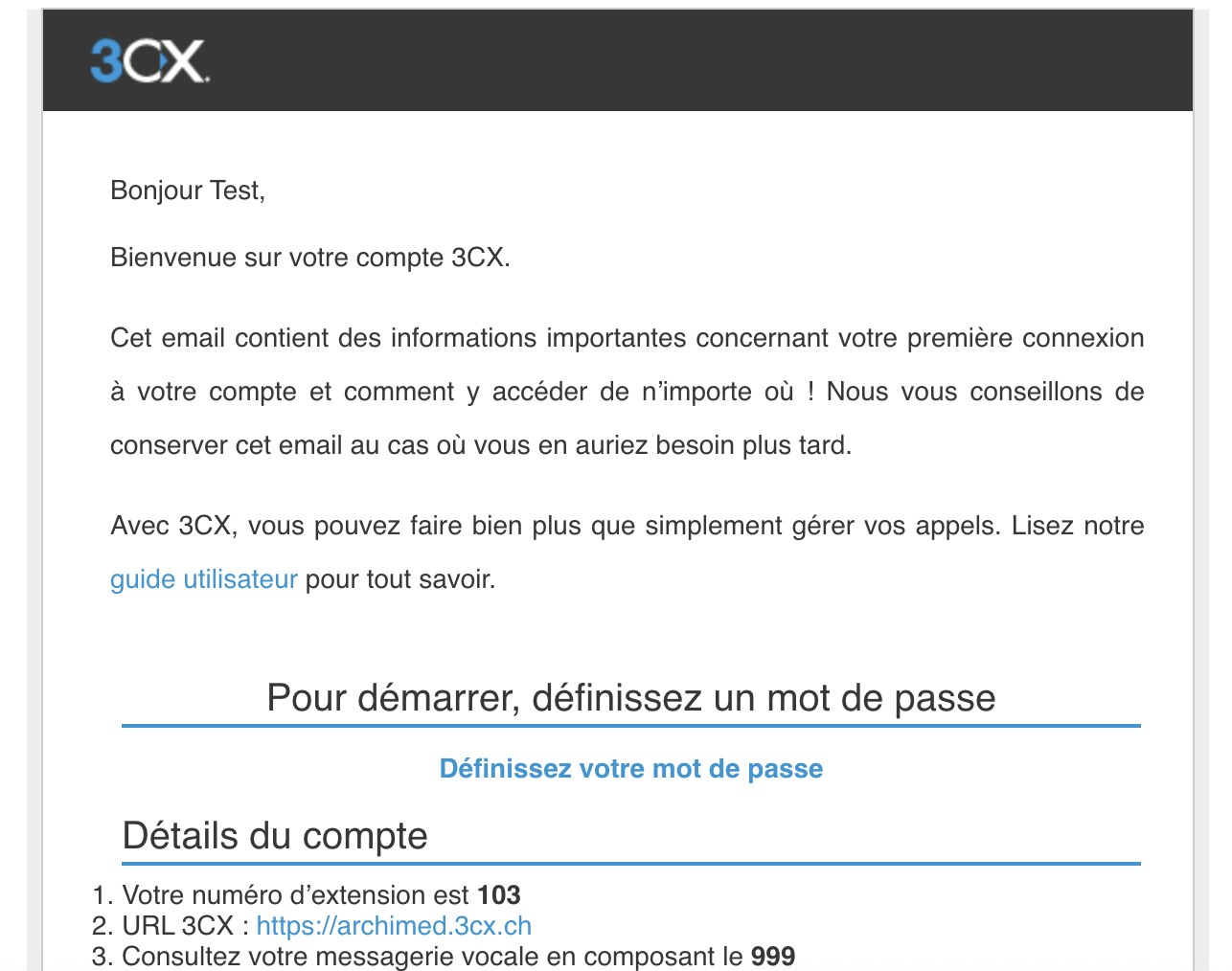 Il est important de noter que cet email contient des informations importantes concernant votre compte utilisateur (votre numéro d'extension, code PIN pour votre messagerie vocale (si actif), ...) ! -